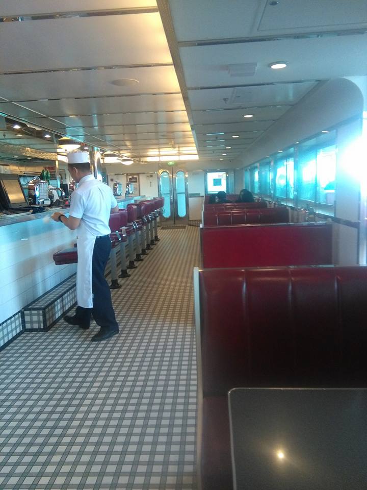 Makan siang kami di hari kedua bukan di Windjammer. Kami diajak untuk mencoba sajian resto burger Johnny Rockets. Berkonsep ala western 50-an, interiornya pun menyesuaikan. Kursi bar tinggi, warna serba merah-hitam-putih, dan musik oldies. Sangat casual.