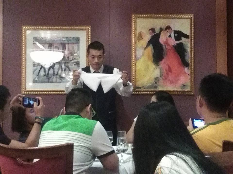 Di makan malam terakhir, makan malam agak berbeda dengan hari-hari sebelumnya. Kami kembali ke Top Hat and Tails. Xiaolong dan Pak Gede melayani kami dengan sama baiknya. Bahkan, Xiaolong membuatkan beberapa hiasan kepala dari sapu tangan untuk beberapa perempuan di grup indo. Waiter mengingatkan bahwa akan ada parade spesial sebagai tanda perpisahan dari tim dapur dan restoran. Ternyata nyaris seluruh waiter memberhentikan kegiatan mereka sejenak, dan masuk ke dalam dapur. Ketika keluar, puluhan waiters dari berbagai negara berbaris dan melambai-lambaikan sapu tangan dan berkeliling di ruang makan. Tampaknya itu juga terjadi di dua decks lainnya. Kemudian di tangga tengah deck 3, waiters dan chefs mempertunjukan beberapa kebolehan, seperti menyanyi dan menari. Sekejap, orang-orang beranjak dari mejanya dan merangsek ke bagian tengah restoran untuk menyaksikan aksi itu. Dilayani selama empat malam berturut-turut membuat kebanyakan penumpang merasa memiliki keterikatan dengan para waiters. Banyak dari mereka yang mengajak berfoto dan memberikan tip.