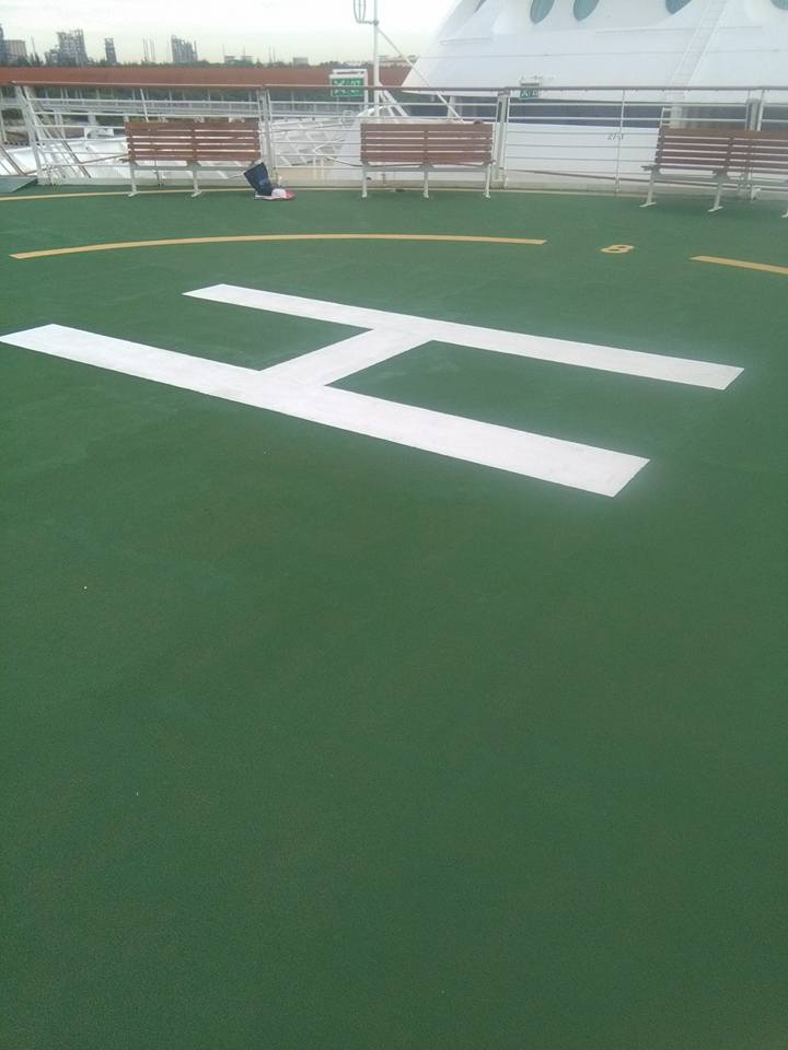 Meski sudah waktunya turun kapal untuk menuju Kuala Lumpur, namun ternyata rombongan kami tidak turun. Kami justru menuju area depan kapal yang sekaligus terdapat helipad. Lokasinya memang sepi, karena tak banyak penumpang yang menyambanginya. Helipad diperlukan jika sewaktu-waktu terjadi keadaan darurat, seperti mengangkut penumpang yang sakitnya tak mampu ditangani petugas medis di atas kapal.