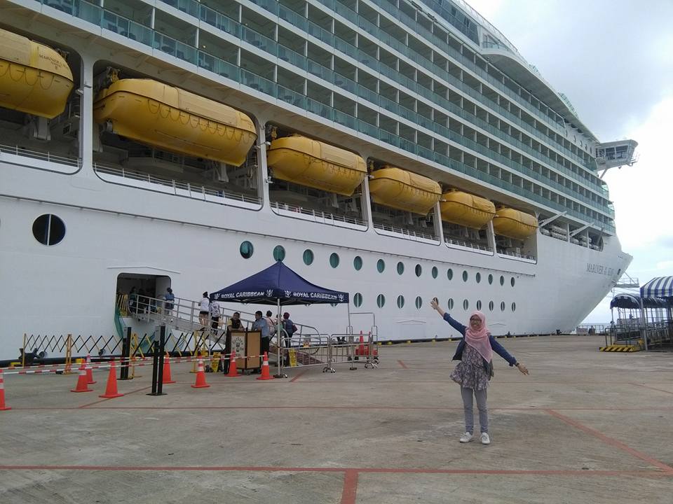 bagian depan ujung kapalPuas mengambil gambar di sini, kami ingin menyaksikan badan kapal dari kejauhan. Maka kami turun menuju Port Klang, Malaysia meski tak turut serta ke KL. Di pelabuhan disediakan supermarket mini, toko souvenir, dan jika bisa mengambil sudut yang tepat, bisa berfoto dengan badan kapal yang besar tampak kejauhan.