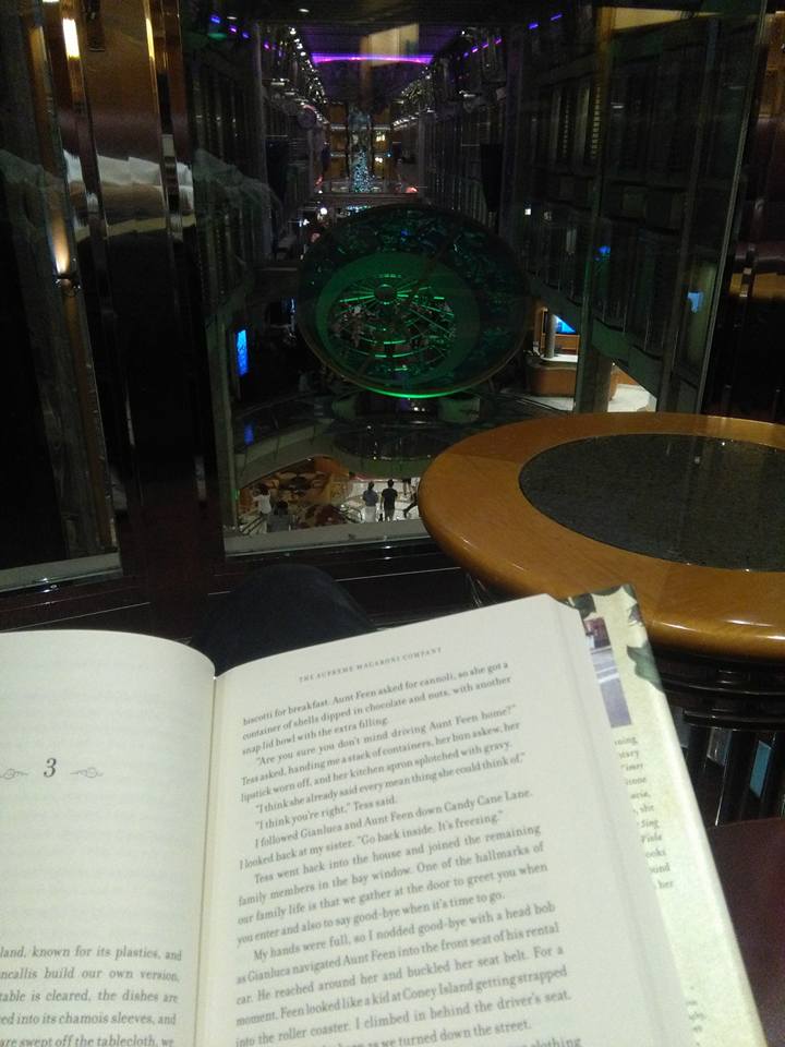 Karena saya kerap bangun terlalu pagi dan masih ada sela waktu sebelum waktu breakfast, saya iseng saja keluar kamar karena ingin tahu kondisi kapal di pagi hari. Selain itu juga memang ingin mampir ke perpustakaan (buka 24 jam!). Ternyata memang acara yang berakhir larut semalam membuat mayoritas penumpang masih lelap. Saya hanya sesekali berpapasan dengan crew yang bertugas. Dan benar, saya kemudian leluasa memelototi satu per satu punggung buku yang ada di rak. Karena mengambil secara acak, saya memilih The Supreme Macaroni Company milik Adriana Trigiani, dan beberapa kali membuka-buka Webster Dictionary of American Writers. Kadang ada kegembiraan yang tidak bisa didapatkan dengan melakukan aktivitas fisik. Kebutuhan untuk tenang dan berdialog dengan diri sendiri. Karena itulah perpustakaan yang nyaman jadi favorit saya di antara fasilitas yang lain.