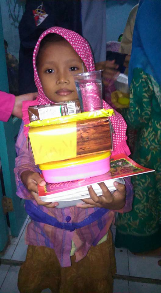 Nabila kecil yang kerepotan membawa pulang makanan dan hadiahTidak ada ekspektasi dalam benak kami semua bahwa acara akan sebegini meriah. Meski mesti menjelma Bandung Bondowoso yang menyiapkan segalanya dalam satu malam, hasilnya sama sekali tak mengecewakan. Donasi bahkan jauh berlebih dari yang kami harapkan, sehingga adik-adik bisa tersenyum gembira. Rasanya itu tak bisa digantikan oleh apa pun di hati kami. Saya mustahil melakukannya sendiri tanpa bantuan penuh ketulusan dari teman-teman volunteer dan para donatur. Terima kasih untuk kerja kerasnya, teman-teman volunteer : Ghozi, Icha, Devi, Winda, Dian, Ovie, Nindy, Arifah Siti Arifah , Mas Hariadi, dan Rahenda. Terima kasih untuk begitu banyak perhatian dan kesediaan untuk selalu hadir kembali demi adik-adik. Terima kasih untuk para donatur yang tak satu pun ingin disebutkan namanya. Saya tahu kalian membaca post ini. Terima kasih banyak dari hati saya yang terdalam.