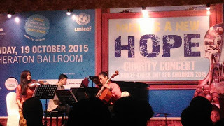 Karena kebaikan hati Mbak Gema Swaratyagita, saya bisa nonton bersama teman-teman dari Pertemuan Musik Surabaya di hari itu, 19 Oktober 2015. Antusiasme penonton sangat bagus. Terbukti, begitu pintu ballroom Sheraton dibuka, kursi di baris-baris terdepan dengan cepat terisi. Kami mendapat tempat di bagian tengah ruang. Beberapa kali menonton pertunjukan musik di lokasi yang sama, saya jarang memilih bagian tengah dan cenderung agak ke belakang. Jadi, sedikit banyak saya penasaran dengan sensasi baru ini. Sembari menunggu audiens berdatangan, hadirin disajikan video-video tentang anak-anak dari berbagai negara.