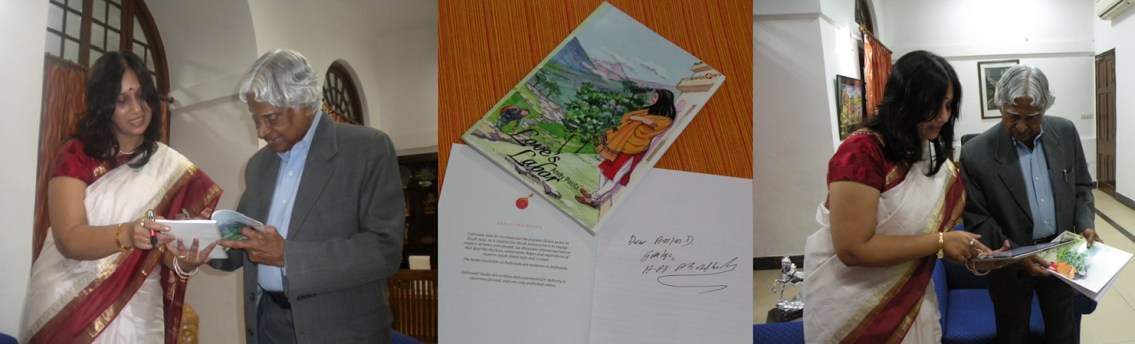 Dr Kalam autographing Loves' Labor; his autograph; reading the novella on the iPadThe first thing I noticed about the former Prez was how frail he had become in ten years. He was as inspirational though, taking interest in the digital format, appreciating how we are saving trees by not paper-printing, fascinated about how global Indireads is with the authors, editors, publisher, marketing- all working out of different countries, complimenting entrepreneurs that they are the employment-generators and not employment-seekers and saying all the things a budding writer would take home with her.