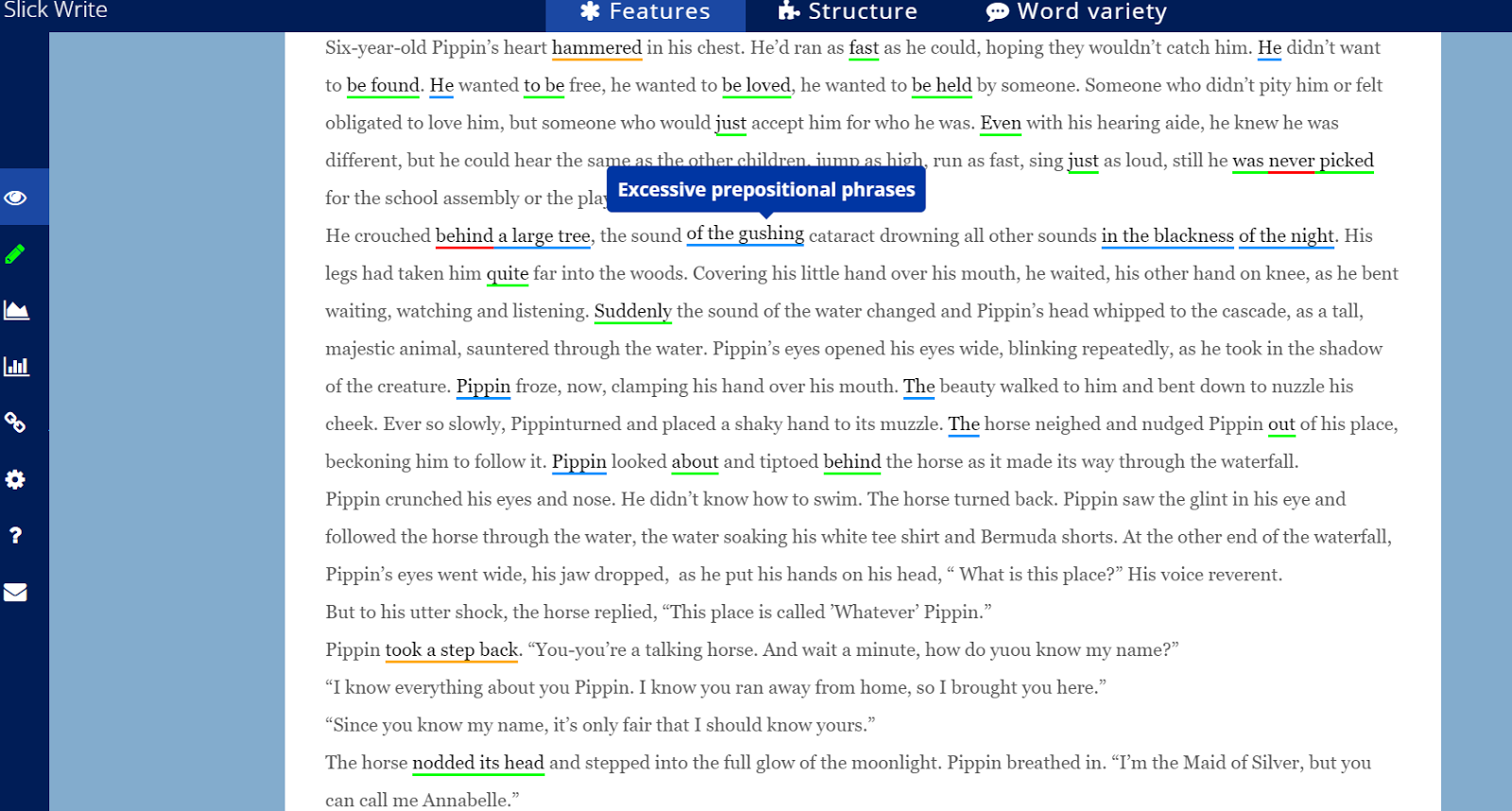 I do like Slickwrite. I used it in place of Ginger, except that there's too much correction on the page. You can see all the green, red and blue. It also looks at phrases in detail as you can tell by the red lines. But it can be overwhelming. So I'm not too sure about using it for my manuscript although I do use it for shorts. If you like this style of editing then you can go ahead. It also has structure and other features which you can use if you pay for it.