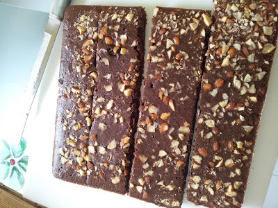 I'm also going to share my Christmas Brownies recipe. I usually don't frost them, they taste fantastic without it just cover the top with nuts, in this case almonds. I also use a silicon mold, it just comes out so much cleaner and the base never burns. You can cut down the sugar and cocoa too. It still turns out. Oh and one more tip, don't beat or whisk your mixture, you don't need to incorporate air.