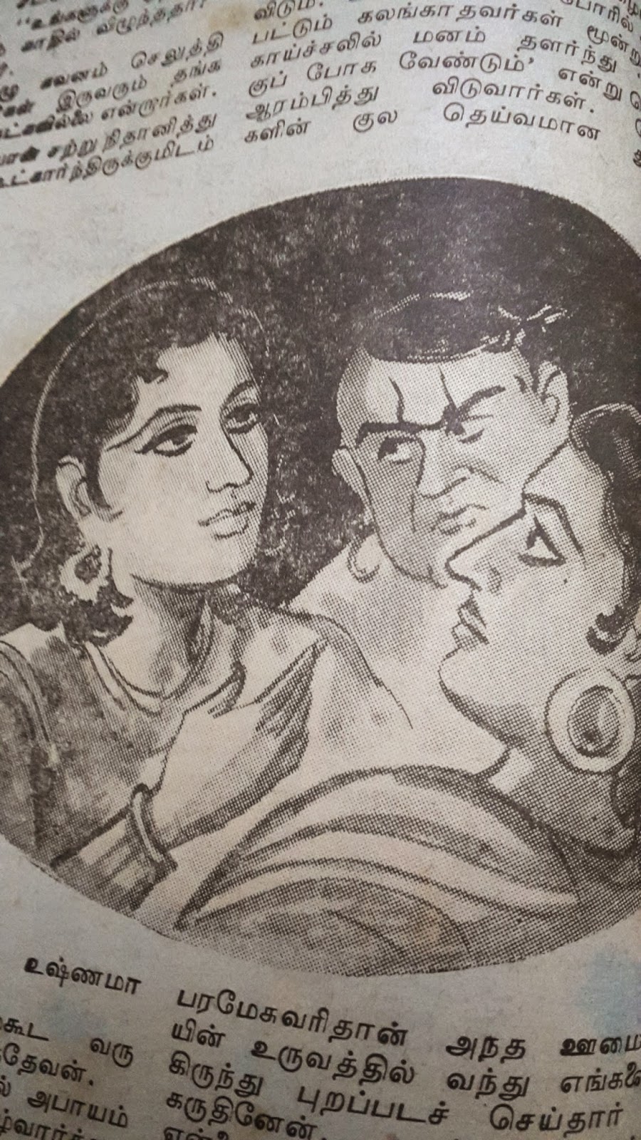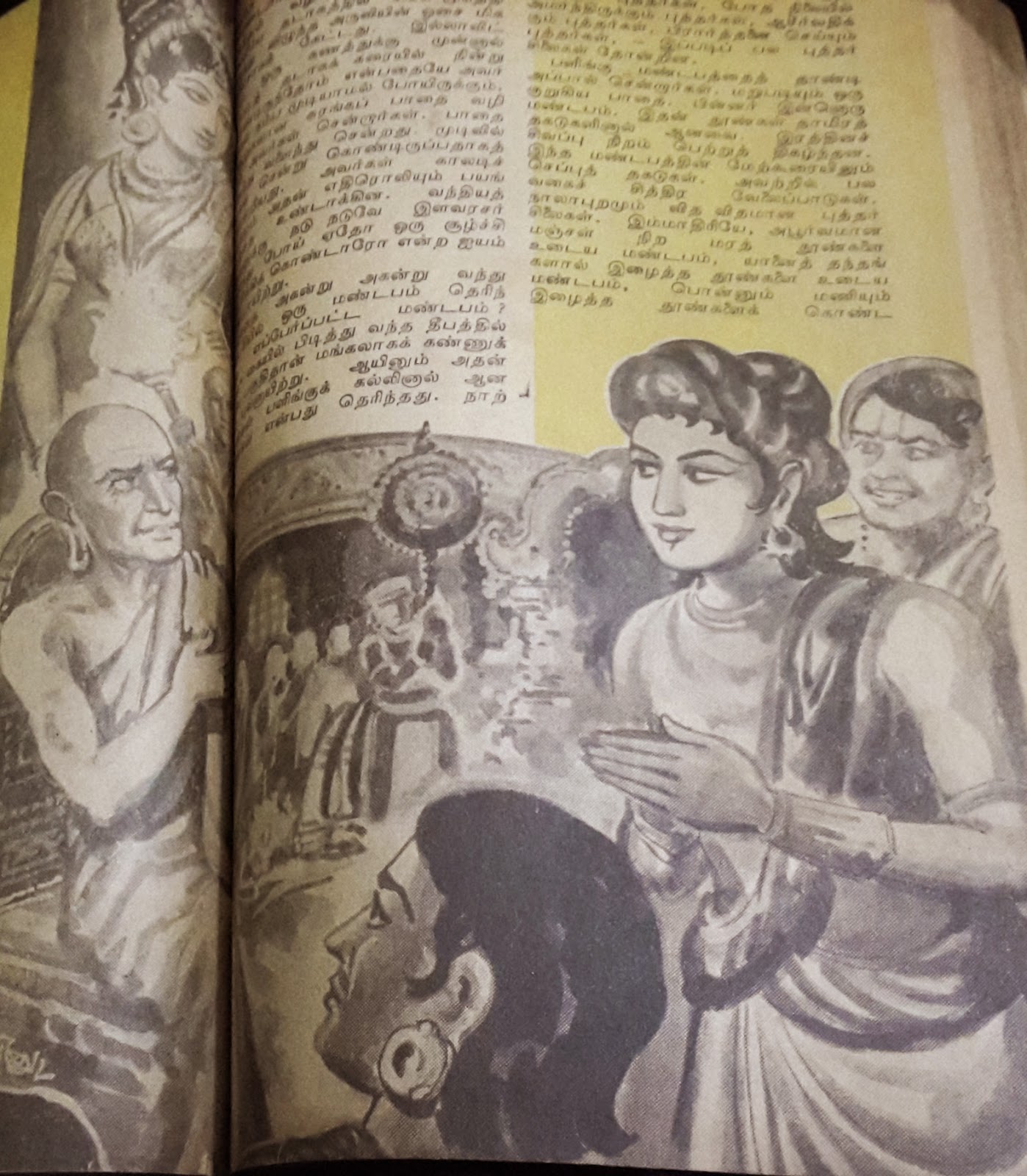Vandiya Devan crossed the street hurriedly to reach the place where the Prince and Nandini stood. By the time he was across the street, he was not sure whether he had seen Nandini at all? How could it be Nandini? Though her face had resembled Nandini’s, she was attired simply like a sanyasi, with no jewels on her person and her wind-blown hair was moving in waves around her.