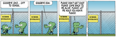 This four-panel comic strip from the often-hilarious and often-sombre Pearls Before Swine packs an incredible emotional gut punch in only a few words. This is a pain that almost anyone can relate to, whether or not they’ve experienced a school shooting.