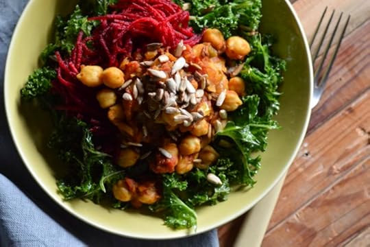 The seasoned chickpea dish chana masala, while traditionally meatless, gets a new twist in this recipe. Served over a kale alongside shredded beets and sunflower seeds, it’s part salad, part curry and totally delicious. This recipe comes to us from Alexandra of The New Baguette. Serves 4. For the chana masala: 1 tablespoon organic
