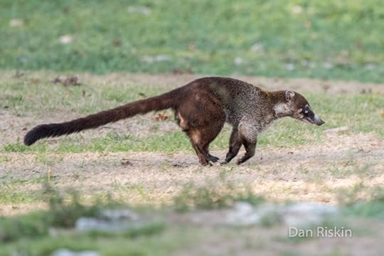 For all my sneaking around to find wildlife, this guy was sauntering along in the middle of the field when we drove up to it in our van. I jumped out and snapped some shots while it ran away. Pretty good-looking mammal. It’s a procyonid – the raccoon family.