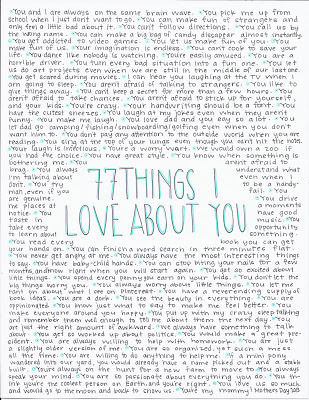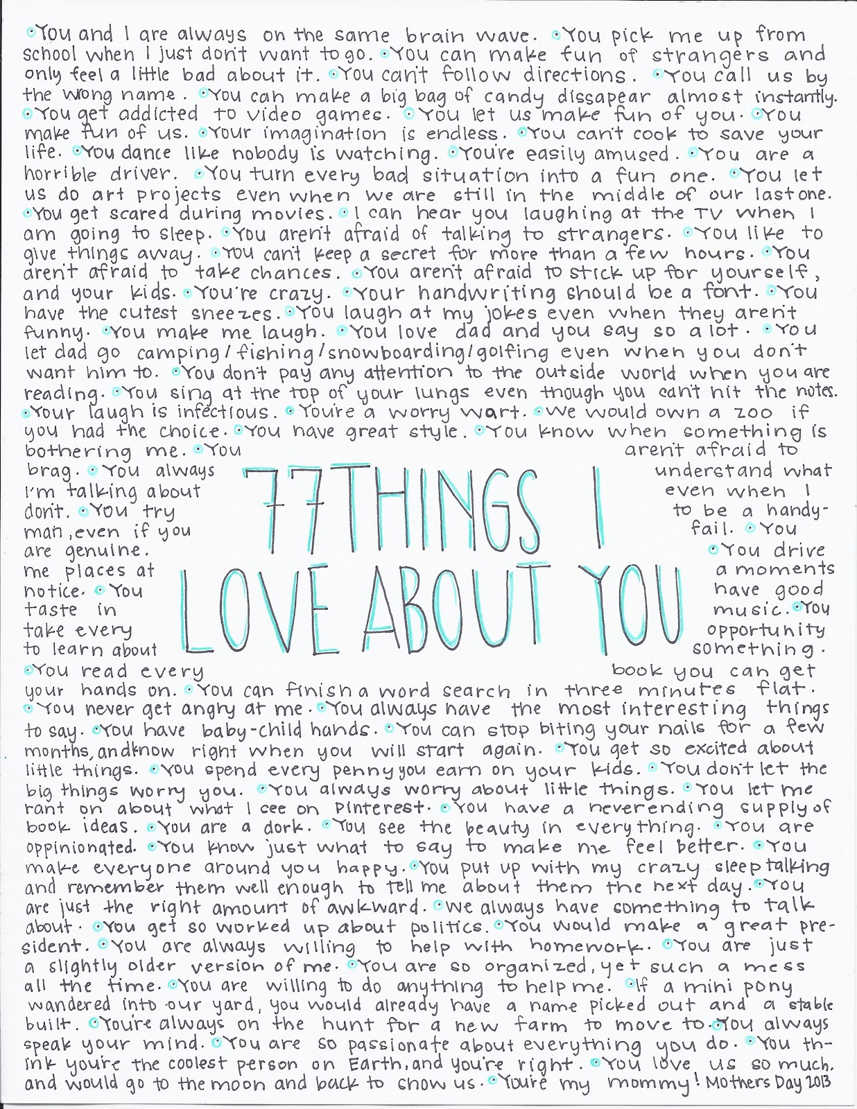 You and I are always on the same brain waveYou let us make fun of youYou make fun of usYour imagination is endlessYou can't cook to save your lifeYou dance like nobody is watchingYou're easily amusedYou are a horrible driverYou turn every bad situation into a fun oneYou pick me up from school when I just don't want to goYou can make fun of strangers and only feel a little bad about itYou can't follow directionsYou call us by the wrong nameYou let us do art projects even when we are still in the middle of our last oneYou get scared during moviesI can hear you laughing at the TV when I'm going to sleepYou aren't afraid of talking to strangersYou like to give things awayYou can't keep a secret for more than a few hoursYou aren't afraid to take chancesYou can make a bag of candy disappear almost instantlyYou get addicted to video games (i.e. Candy Crush)You aren't afraid to stick up for yourself and your kidsYou're crazyYour handwriting should be a fontYou have the cutest sneezesYou laugh at my jokes even when they aren't funnyYou make me laughYou love Dad and you say so a lotYou let Dad go camping/fishing/snowboarding/golfing even when you don't want him toYou don't pay attention to the outside world when you are readingYou sing at the top of your lungs even though you can't hit the notesYour laugh is infectiousYou're a worry wartWe would own a zoo if you had the choiceYou have great styleYou know when something is bothering meYou understand what I'm talking about even when I don'tYou try to be a handyman even if you failYou are genuineYou drive me places at a moment's noticeYou have good taste in musicYou take every opportunity to learn about somethingYou read every book you can get your hands onYou can finish a word search in three minutes flatYou never get angry at meYou always have the most interesting things to sayYou have baby-child handsYou can stop biting your nails for a few months and know right when you will start againYou get so excited about little thingsYou spend every penny you earn on your kidsYou don't let the big things worry youYou always worry about the little thingsYou let me rant on about what I see on PinterestYou have a never ending supply of book ideasYou are a dorkYou see the beauty in everythingYou are opinionatedYou know just what to say to make me feel betterYou make everyone around you happyYou put up with my crazy sleep talking and remember them well enough to tell me about them the next dayYou are just the right amount of awkwardWe always have something to talk aboutYou get so worked up about politicsYou would make a great presidentYou are always willing to help me with homeworkYou are just a slightly older version of meYou are so organized, yet such a mess all the timeYou are willing to do anything to help meIf a mini pony wandered into our yard, you would already have a name picked out and a stable builtYou're always on the hunt for a new farm to move toYou always speak your mindYou are so passionate about everything you doYou think you're the coolest person on Earth, and you're rightYou love us so much and would go to the moon and back to show usYou're my mommyIt feels good to be known inside and out!