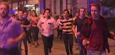 La gente comincia a fuggire verso il Caffe Paszkowski e la libreria Red, cercando riparo fra le arcate dei loggiati e dentro la libreria.