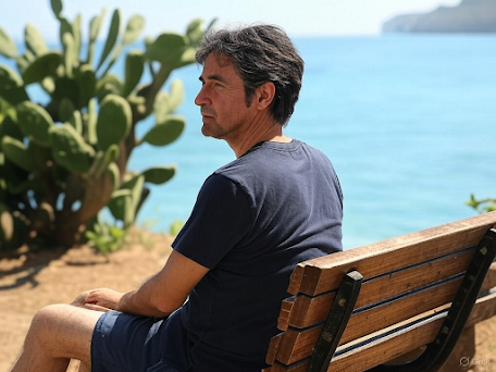 I sit here in front of the sea—blue water, light wind, hot is the sun, I sit among the cacti on a bench overlooking the sea along the small promenade that runs along the coves of the Castiglioncello sea.