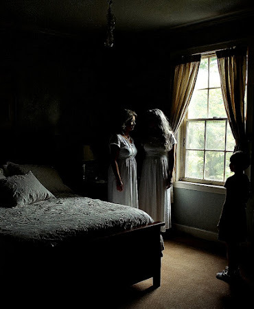 On the right side two women are standing by and talking, one is my mother she’salmost hidden in the dark, the other woman tall and slim in a white night-gownwith long and flowing grey hair her mother (my grandmother Laura) they talk.