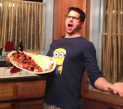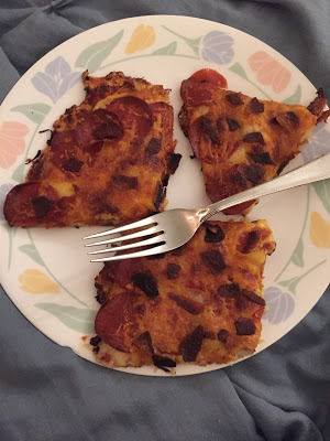Meatsa! Crust is made from ground chicken. Oh, so good!The exercise program is straightforward and easy to do. We focus a lot on bodyweight training, and we sprint once a week (tabatas). Boy, do we hate tabatas, but they're great for us! And we walk...a lot.