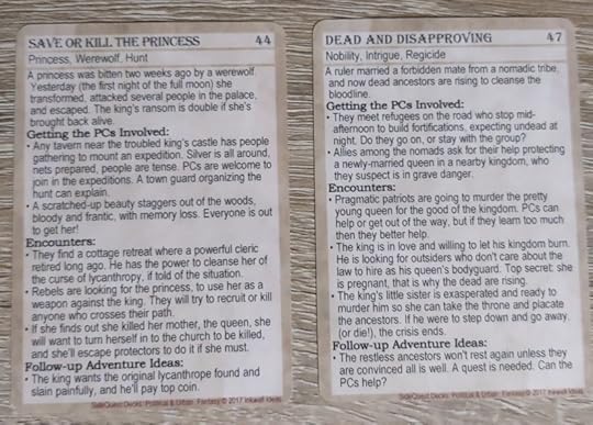 The Sidequest Decks from Inkwell Ideas are another wonderful accessory designed for TTRPGs, but can easily be used for writers as well. This time around I went back to the After the Total Party Kill deck, and again, I went with two options as prompt inspiration. You can use either option, and you can either use the basic concept at the top of the card, or you can use the various encounters at the bottom of the card to expand upon the adventure/story further.