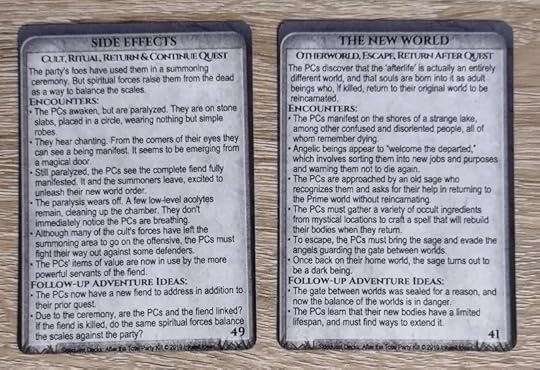 The Sidequest Decks from Inkwell Ideas are another wonderful accessory designed for TTRPGs, but can easily be used for writers as well. This time around I went back to the After the Total Party Kill deck, and again, I went with two options as prompt inspiration. You can use either option, and you can either use the basic concept at the top of the card, or you can use the various encounters at the bottom of the card to expand upon the adventure/story further.