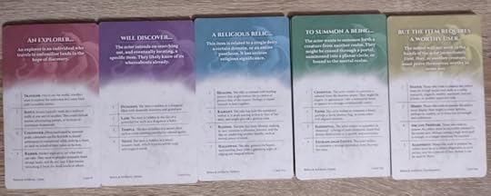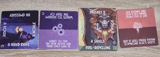 Finally, we have a new addition to the prompt generation: The Oracle Story Generator by Nord Games. They have a Character Generator as well, but that one won’t be shipped out for another couple months. I’ve enjoyed playing around with these cards the past couple months, and look forward to doing even more with them in future. With this prompt, you can make it even more specific by either rolling a four-sided die for each card, or by simply choosing which option you like best.