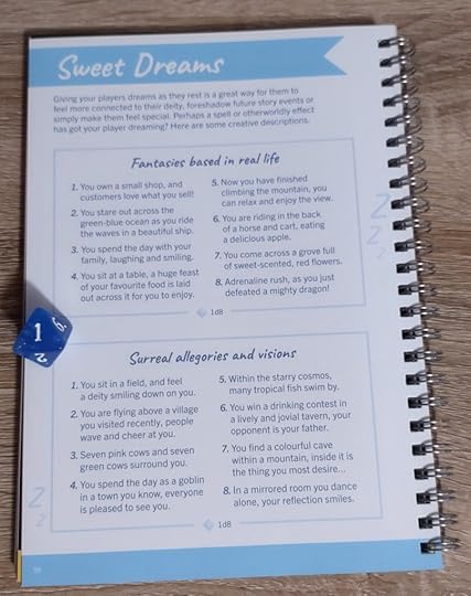 This month I decided to roll the dice on the Sweet Dreams page in the Roll & Play book, and there are two different dreamy options to choose from. You can use the dice I rolled, or if you have your own d20, you can roll on the chart yourself. Or heck, if you want to then you can just choose whichever option sparks your interest.