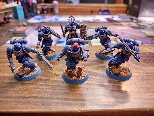 DavidPainting: So I finally got a good varnish coat on the Ultramarines. That will save the paint from wearing off with gameplay and what not. I have almost finished the Mirko, decided to go fancy and try doing some highlights to that one.