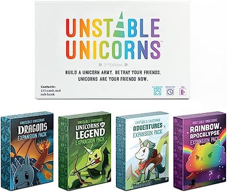 Build a Unicorn Army. Betray Your Friends. Unicorns are Your Friends Now.Unstable Unicorns is a strategic card game that will destroy your friendships but in a good way.The game was one of Kickstarter’s top 100 most backed projects of all time and has sold over a million copies worldwide.Unstable Unicorns won the 2019 People’s Choice Award for Toy of the Year.Build a Unicorn Army. Betray your friends. Unicorns are your friends now.Our ThoughtsUnstable Unicorns is a strategic card game about everyone’s two favorite things: Destruction & Unicorns. The goal of Unstable Unicorns is to be the first person to collect seven Unicorns in your play area, also known as your Stable. Use Magic, Instant, Upgrade, and Downgrade cards to hinder your opponents’ progress and destroy their Unicorns. But beware — each player has all of these tools at their disposal as well, and you may just find your plans foiled by a well-played “Neigh!” card. Get ready to destroy your friendships…but in a good way.