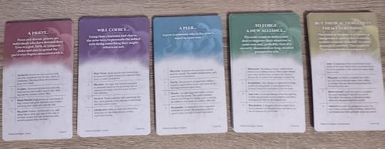 The Sidequest decks from Inkwell Ideas are another wonderful accessory designed for TTRPGs, but can easily be used for writers as well. This time around I went back to the Political and Urban Fantasy deck, and again, I went with two options as prompt inspiration. You can use either option, and you can either use the basic concept at the top of the card, or you can use the various encounters at the bottom of the card to expand upon the adventure/story further.
