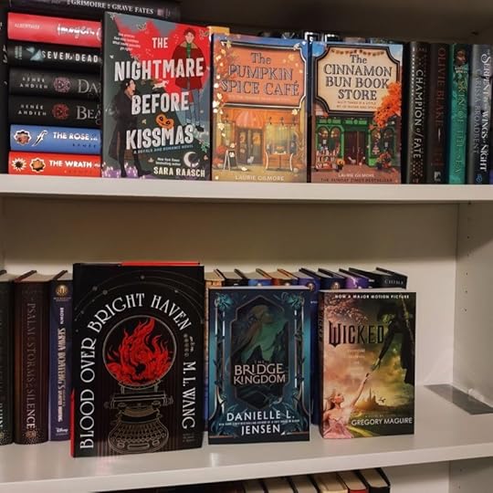 I picked up The Nightmare Before Kissmas by Sara Raasch, The Pumpkin Spice Cafe by Laurie Gilmore, The Cinnamon Bun Book Store by Laurie Gilmore, Blood Over Bright Haven by M.L. Wang, The Bridge Kingdom by Danielle L. Jensen, and Wicked by Gregory Maguire.