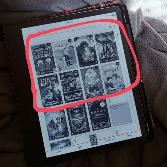 When Life Gives You Legends by Luna Ryder, Falling for Scotland by Kaitlyn Collins, The Academy of the Dead by Vermilion H. Baine, The Death Bringer by A.M. Eno, Love Letters & Thirst Tonics by Hailey Blackwood, The Bartender Between Worlds by Herman Steuernagel, A Drop of Fortune by Danielle Garrett, Good Game, Gamer Girl by Reina Zoric, and (not pictured) Blood Price by Nicole Evans.