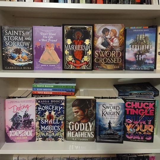 Saints of Storm and Sorrow by Gabrielle Buba, Don’t Want You Like a Best Friend by Emma R. Alban, Masquerade by O.O. Sangoyomi, Sword Crossed by Freya Marske, The Surviving Sky by Kritika H. Rao, Dating & Dismemberment by A.L. Brody, Sorcery and Small Magics by Maiga Doocy, Godly Heathens by H.E. Edgmon, The Sword of Kaigen by M.L. Wang, Bury Your Gays by Chuck Tingle