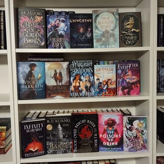 A River of Golden Bones by A.K. Mulford, This Guilded Abyss by Rebecca Thorne, Unworthy by J.A. Vodvarka, These Deathless Shores by P.H. Low, Caraway of the Sea by Madeline Burget, The Wicked Bargain by Gabe Cole Novoa, Travelers Along the Way by Aminah Mae Safi, Starlight and Shadows by Vera Winters, Sir Callie and the Champions of Helston by Esme Symes-Smith, So This Is Ever After by F.T. Lukens, Infinity Alchemist by Kacen Callendar, Babel by R.F. Kuang, Blood Over Bright Haven by M.L. Wang, The Poisons We Drink by Bethany Baptiste, Song of the Six Realms by Judy I. Lin