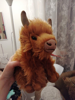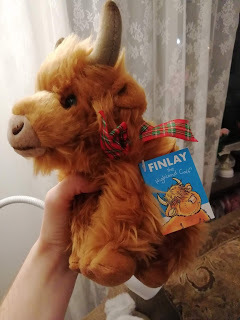 My sister's boyfriend bought a Highland cattle stuffed animal from Scotland. He visited Edinburgh in May: