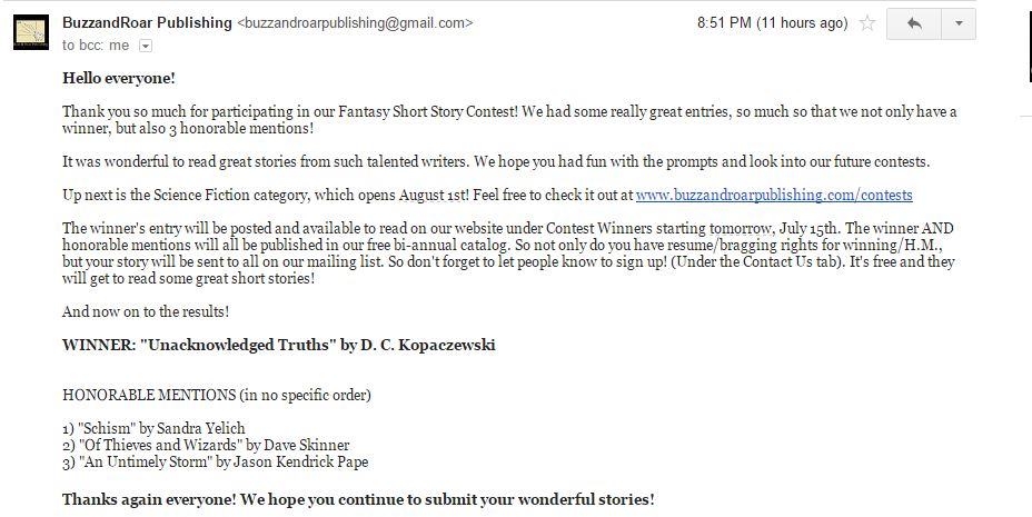 I am happy, happy, happy. This morning I received an email telling me I was awarded an honourable mention in a writing contest. It blew me away.