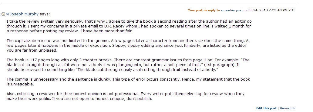To be clear, I'm not blaming the writer on this one. I think the fault lies very much with the editor. If you are going to call yourself an editor and charge for it you should at least understand basic grammar rules. That's not even editing; it's simply proofreading which Kimberly Rieckmann did not do either. To follow that up with criticizing an honest review is unprofessional and just ridiculous.