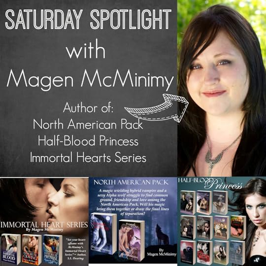 Amazon: http://www.barnesandnoble.com/w/immortal-blood-magen-mcminimy/1114719650?ean=2940016510774 B&N: http://www.barnesandnoble.com/w/half-blood-princess-magen-mcminimy/1108020166?ean=2940148494041 Now that we all know where to find her amazing books.... Like I said, she has too many to put them all... so the links are to the first in each series! I got off track again, okay, back to Magen and more about her..... here is my fun little interview to find out what makes Magen tick! What did you want to be when you grew up? Was it always a writer?I wanted to be a lawyer when I was way younger then I went to school and became a wedding planner. If you could be any animal, what would it be, and why?I totally want to be Hawk… birds of prey are my new obsession. If you could have any super power, what power would it be? I would want to be Mystic from X-Men, that probably says a little too much about me. Top Ten places you want to visit in your lifetime.....RussiaRomeSpainLondonEgyptBrazilVeniceNew ZealandScotlandIreland Do you use real people to influence your characters, or are they completely formed when they come to you?They are created as I write them; generally I just know the basics of their personalities when I start writing. The absolute best part about writing a book for you? The worst?I love building words and characters that thrive within them, the worst is definitely editing, thank god for my amazing editor, Cynthia Shepp. Why did you choose to be a part of Dauntless Indies?I was asked a while ago to join and I was hesitant not because I didn’t love the ladies involved but there is a lot involved with Dauntless Indies and I wasn’t sure I would have the time to meet the goals of the group. However as I saw more of what they were trying to achieve I knew I wanted to be involved with getting the group there. What are you working on now? What are your writing aspirations for 2014?I am currently working on an anthology submission and once that is complete I hope to finish out my Immortal Heart Series this year and then hopefully focus a bit of my energy on marketing the books I have written. Coffee or Tea? Ginger or peppermint tea. What is your writing process like? Do you have to have complete quiet, or noise?Music, I need music in order to write. What is your favorite line that you have ever written?I have 18 total titles there is no way I can choose between all of them. If you had to hang out with any of your characters, which one would you choose?Hmm… well naturally I would want to hang out with any one of my male characters but the females are fairly kick ass ( in my opinion) so really can I just have a massive party with my entire cast of characters. Thanks so much for stopping by to find out more about the amazing Magen McMinimy! I hope that you all enjoyed it as much as I did... xoxo,Michelle Graves