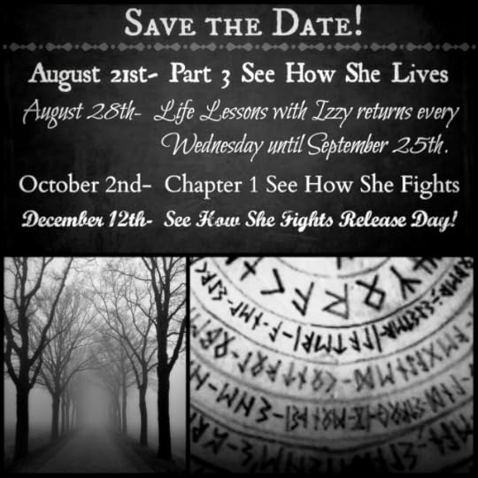 If you have been following the blog for a while, you might remember a segment called Life Lessons with Izzy that I did before the release of See How She Runs. Well, I am bringing it back for See How She Fights. I will post snippets of the story at the end of each post, much like I did the last time. So, if you want to get to know me better, or just get a little inspiration, make sure to check back in for that!