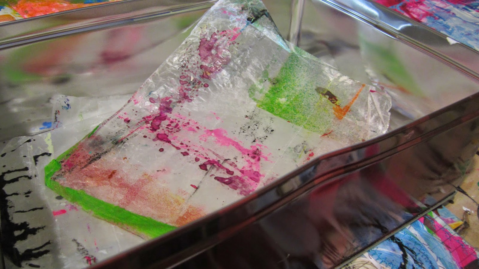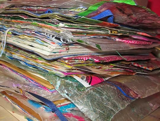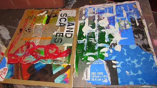 Supplies needed: Journal, notebook, or paper (obviously).Bricks or heavy object to flatten pages or entire books (only when they’re definitely dry). Sometimes I use a blow dryer on pages to make them dry faster.Waxed paper. Keep a stack cut to your page size and layer them between. Even if the pages feel dry to the touch, they may stick when pressed together. Better safe than sorry, although this sticking and ripping process can also add interesting layers.Art supplies, glue, papers, other collected junk.Cheap paintbrushes and sponges. I use the least expensive ones I can find because I mistreat them, leave them soaking in water for days, and I use them in glue as well as paint.