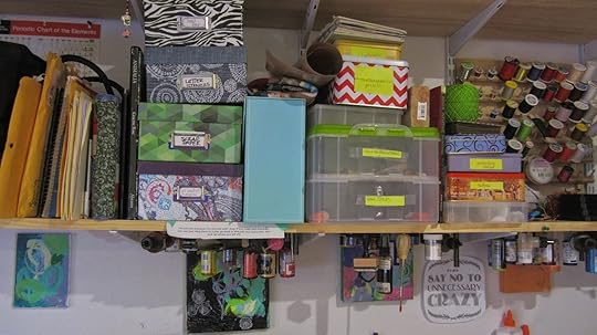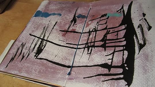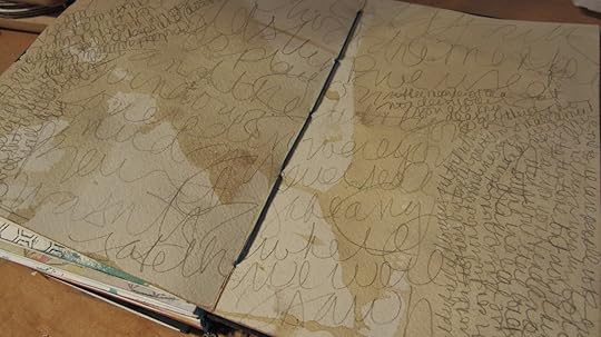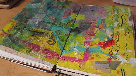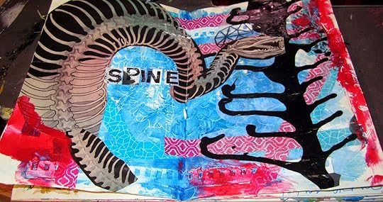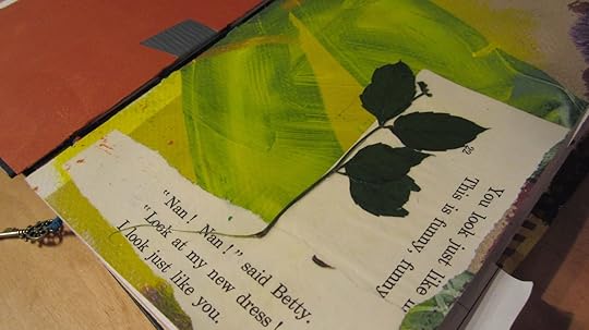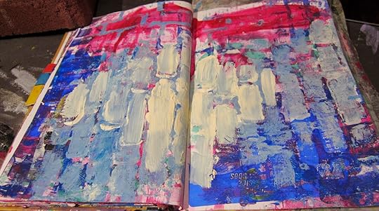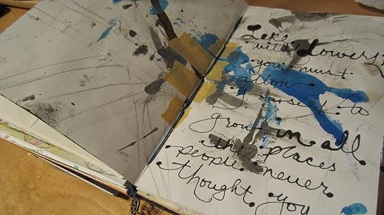Page in progress.Work in 2 (or more) books at a time so that one can dry while you're working on the other one. Dedicate an area, no matter how small, to your journaling so that you can easily add something when the mood strikes. If you have to put everything away and get it back out again to work, you won't do it very often.