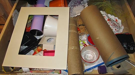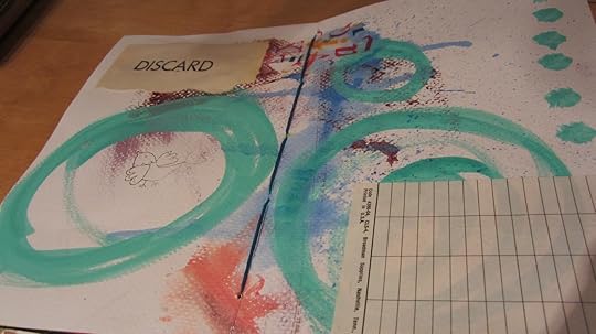 Whenever these organizational boxes are on sale for $.99, I buy a few.Never waste paint or glue. If you have extra on your brush, wipe it on another page which is waiting off to the side for just this purpose. Keep adding to it in this way until you're ready to bring it to center stage.