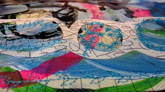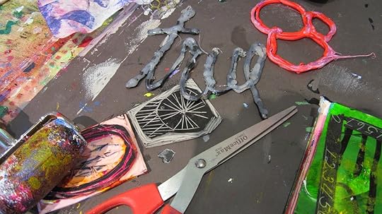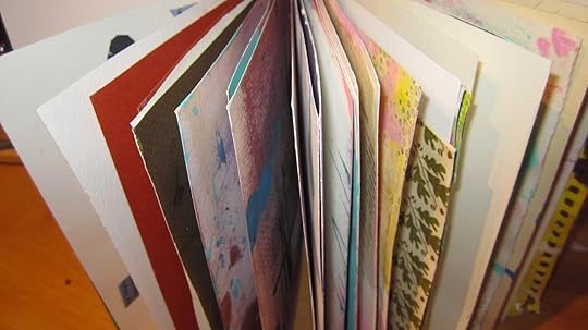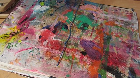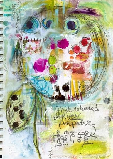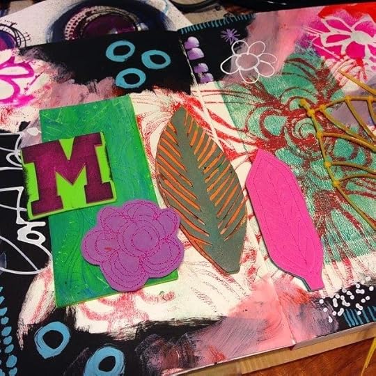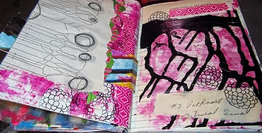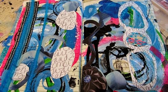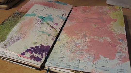 Add shapes: Close your eyes and paint or write with markers.Paint abstract shapes.Carve your own stamps and use them.Glue images (like a face) and then use it as a template to paint over parts.Use household objects as stamps:Lids to a hairspray can, netting that fruit came in, paper doilies, etc. I have a whole drawer of weird things with different shapes.Make your paint watery and let it drip.This is my favorite right now (Thank you, Flora Bowley). Dip vegetables in paint and use to make shapes. Cut potatoes or parsnips into shapes and use to stamp. You can carve these with a knife or something sharp and make lines and interesting shapes.Something that took me a while to learn: When wet, don’t mix warm colors (red, orange, yellow) with cool colors (blue, green) and don’t mix either of these things with the ugly colors like brown, gray, or black. You can use them all in the same page, but let them dry first, otherwise you will get really ugly mud. White goes with anything and the warms and cools can be used together and mixed when wet.