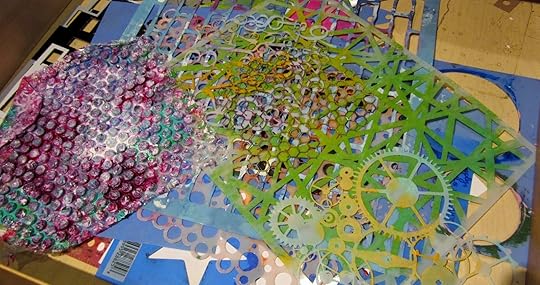 Page in progress.I have quite a few stencils that I've collected over the past few years, but if you don't want to invest in these, be creative and find other ways to stencil. Cut your own designs into styrofoam, or use something with holes in it. Popping paper is my favorite way to add patterned paint to a background.