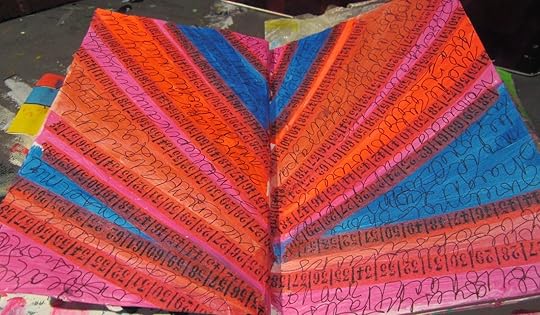 The idea behind these is that for those who don't have experience being creative or putting themselves out there on a page for all to see, working in journals can be almost impossible. I've had several people tell me this in just the past week. The pages of this journal are already a hot mess, so it can't get any worse. :) Also, it shows that one needn't labor over the images or words. I find that layering until it feels right is the best way. Write something and then paint over it. Anything goes.