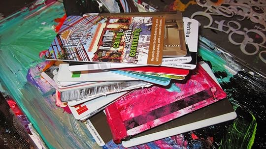 There are people out there doing scrapbooking and journaling with perfectly coordinated papers and expensive tools or organizers. There's nothing wrong with that, but that is definitely NOT what I'm aiming for. The messier the better. I would rather use an old list found abandoned in my grocery cart than any purchased paper, no matter how harmonious the colors. Why? Because those found papers have an energy and life of their own. They represent someone's foray out into the world and I love to bring that into my work.