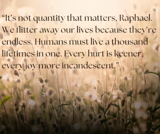 Alt Text - Quote from Archangel's Kiss: “It’s not quantity that matters, Raphael. We flitter away our lives because they’re endless. Humans must live a thousand lifetimes in one. Every hurt is keener, every joy more incandescent.”