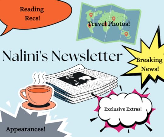 Alt Text: centre image of a stack of three newspapers, with a cup and saucer next to it filled with a hot drink with steam rising from it, with text "Nalini's Newsletter" above it, surrounded by five "clouds" with the following text inside them: Reading Recs!, Appearances!, Travel Photos!, Breaking News!, Exclusive Extras!