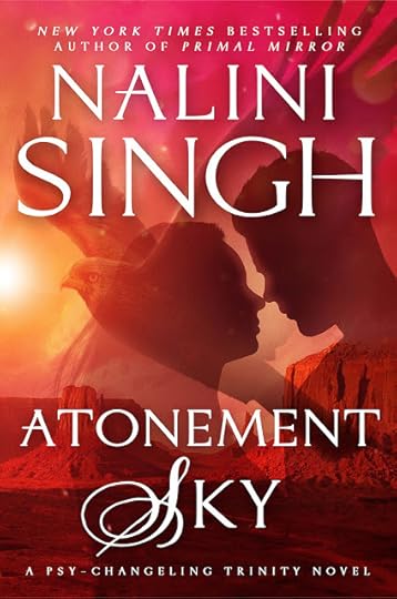 Alt text: Cover of Atonement Sky by Nalini Singh. Background of cover is ombré hues of sunset - reds, deep pinks, oranges, glowing yellow. Background image is of sunset red cliffs and desert. In the foreground is a silhouette of a couple, a man and a woman, looking at each other. A softer image overlying it all is that of a peregrine falcon in flight.