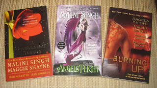 The books on the left and right feature a novella each by Nalini (both from the Psy/Changeling series) plus three novellas from other authors. And the book in the centre consists of novellas from the Guild Hunter series.