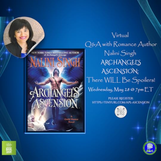 Alt text: Virtual Q&A with romance author Nalini Singh. Archangel's Ascension: there will be spoilers! Wednesday, May 28 at 7pm ET. Please register.