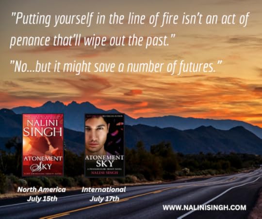 Alt Text - Quote from Atonement Sky: "Putting yourself in the line of fire isn't an act of penance that'll wipe out the past." "No...but it might save a number of futures." North America July 15th/International July 17th.