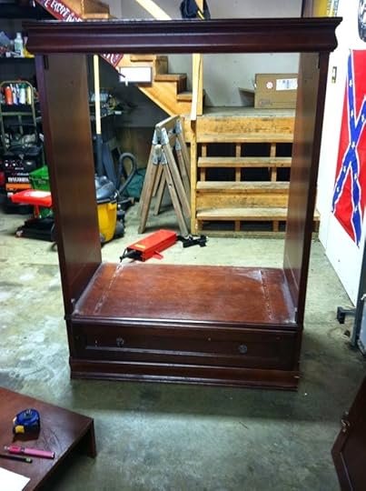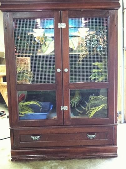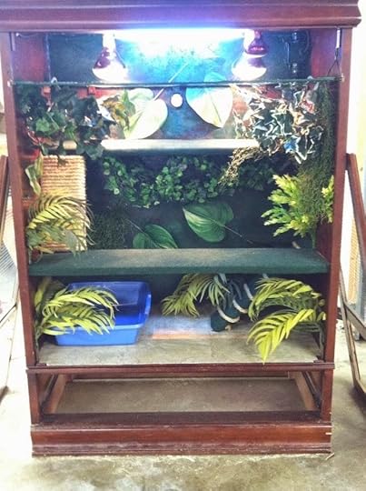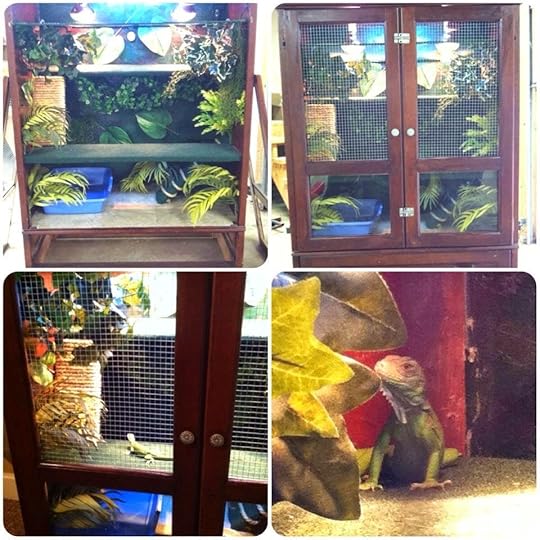 So to start off, we added a new pet to our household a few months ago. A 6 month old green iguana which we named Iggy. He's going to get huge (he's grown 4 inches since we brought him home) so we decided to build him a custom habitat. These babies go for thousands online, which we definitely can't afford so since I'm a creative thinker and my hubby is a handy-man, we opted to make our own. I got an entertainment center for $15, bought a couple hundred $'s worth of material and we went to work. So what started out as this: