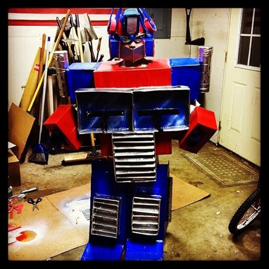 As if that project wasn't enough to do, Halloween was coming up and we LOVE dressing up for that in this house. Last year, all four of us went as the Duck Dynasty family, which was super fun. This year, my 10 year old son, fresh off the Transformers: Age of Extinction kick, decided he wanted to be either Bumblebee or Optimus Prime for Halloween. Sure, why not? Until I looked at said costumes in the Halloween section and was disappointed by both the overall crapiness of said costumes and outrageous prices. This is when the crazy gene seemed to come out of the closet. I told him I would MAKE his costume. ugh.